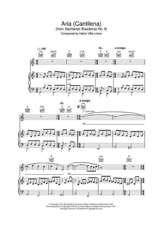 Digital Sheet Music for Aria (Cantilena) from Bachianas Brasileiras No. 5 by Heitor Villa-Lobos, Hayley Dee Westenra scored for Piano/Vocal/Chords; id:389333