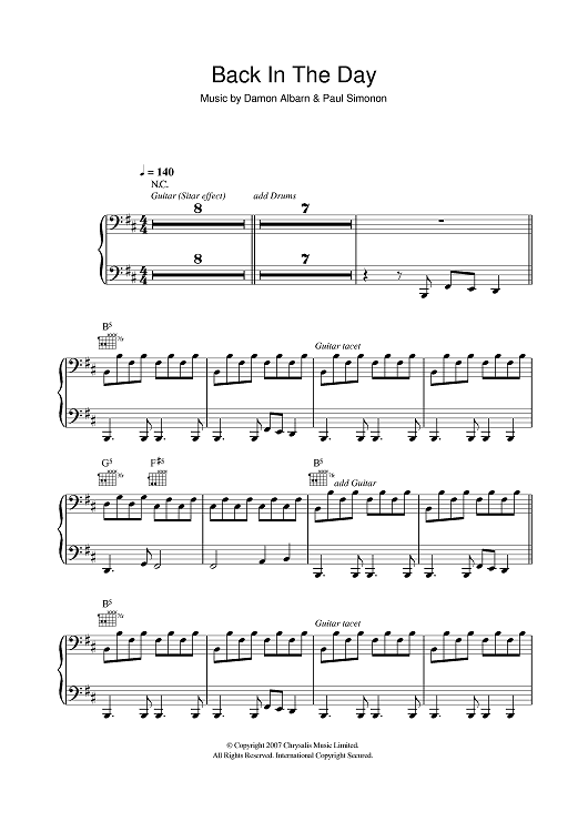 Digital Sheet Music for Back In The Day by Paul Simonon, Damon Albarn scored for Piano/Vocal/Chords; id:401932