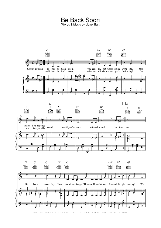 Digital Sheet Music for Be Back Soon by Lionel Bart scored for Piano/Vocal/Chords; id:378509