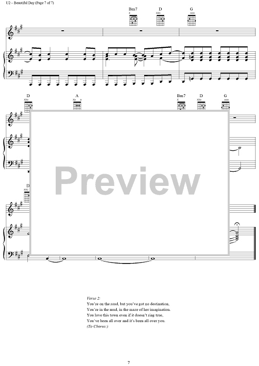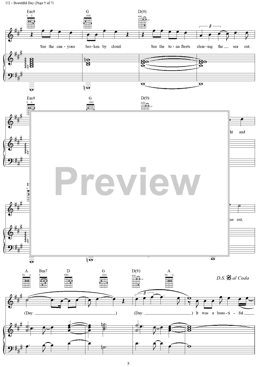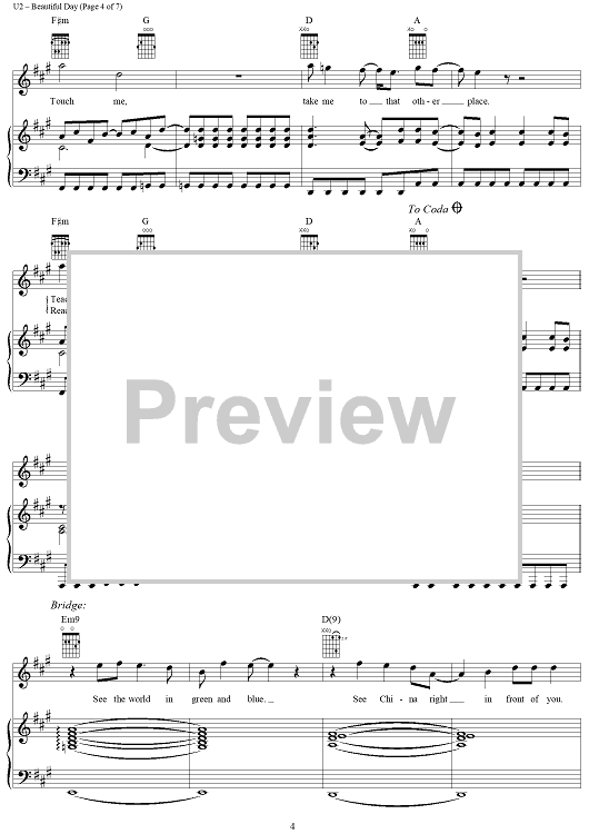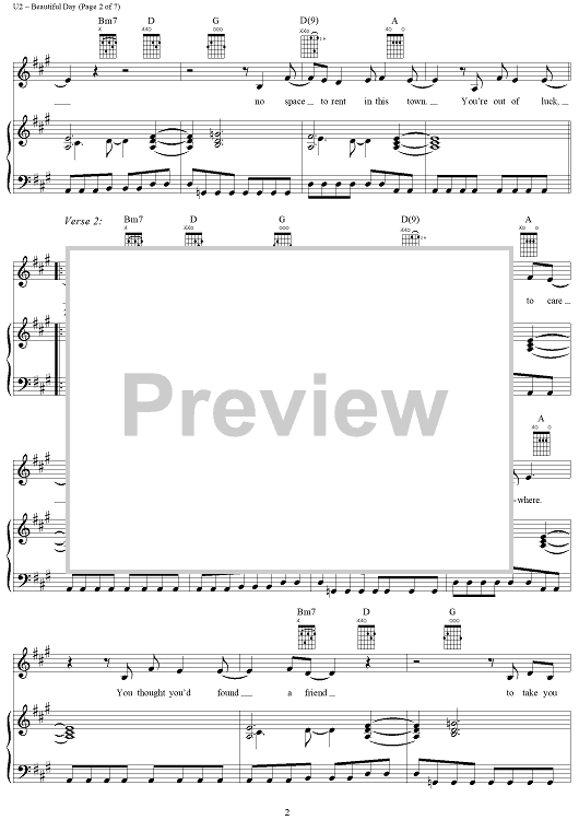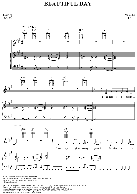 Digital Sheet Music for Beautiful Day by U2, Bono scored for Piano/Vocal/Chords; id:286414