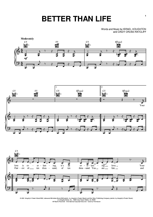 Digital Sheet Music for Better Than Life by Israel Houghton, Cindy Cruse-Ratcliff scored for Piano/Vocal/Chords; id:401493