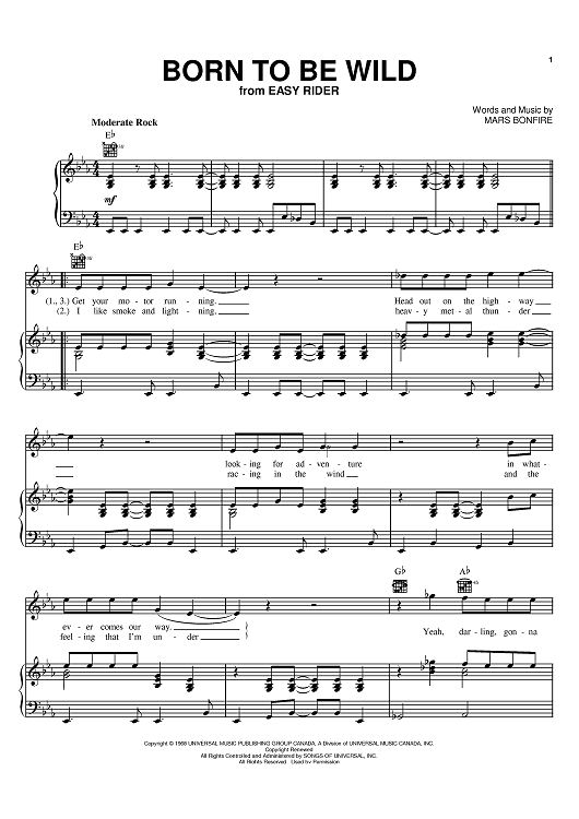 Digital Sheet Music for Born To Be Wild by Steppenwolf, Mars Bonfire, John Kay scored for Piano/Vocal/Chords; id:381622