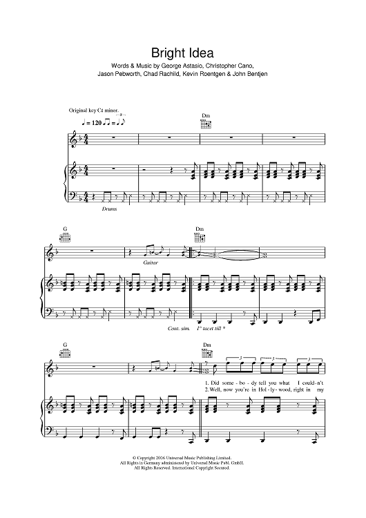 Digital Sheet Music for Bright Idea by George Astasio, John Bentjen, Christopher Cano, Orson, Jason Pebworth, Chad Rachild, Kevin Roentgen scored for Piano/Vocal/Chords; id:393211