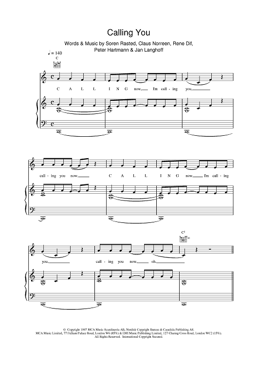 Digital Sheet Music for Calling You by Soren Rasted, Aqua, René Dif, Claus Norreen, Peter Hartmann, Jan Langhoff scored for Piano/Vocal/Chords; id:376635