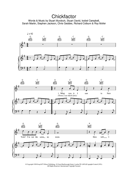 Digital Sheet Music for Chickfactor by Belle & Sebastian, Stuart Murdoch, Stuart David, Isoabel Campbell, Sarah Martin, Stephen Jackson, Chris Geddes, Richard Colburn, Roy Moller scored for Piano/Vocal/Chords; id:379113