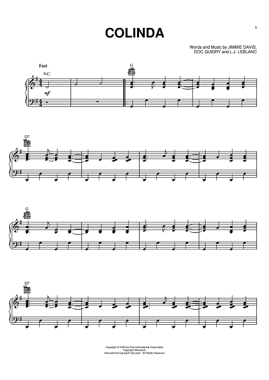 Digital Sheet Music for Colinda by Jimmie Davis, Doc Guidry, L.J. Leblanc, Rockin' Dopsie & The Cajun Twisters scored for Piano/Vocal/Chords; id:383744