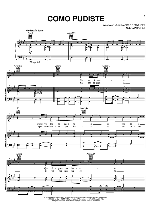 Digital Sheet Music for Como Pudiste by Obed Bermudez, Obie Bermudez, Juan Perez scored for Piano/Vocal/Chords; id:386566