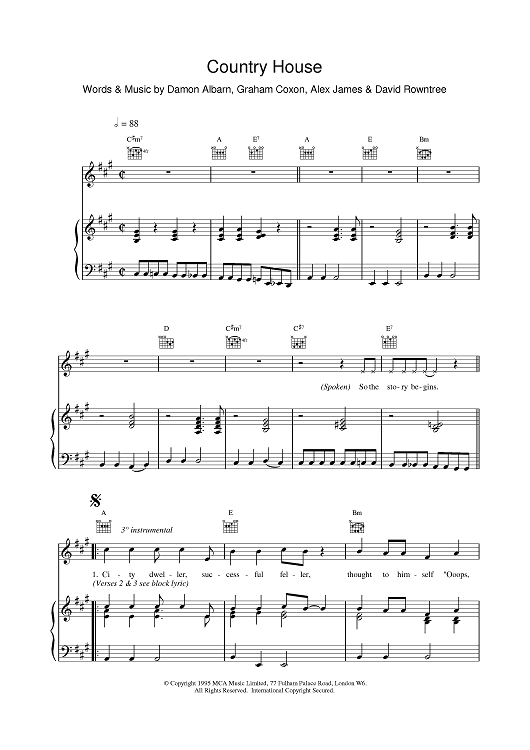 Digital Sheet Music for Country House by Blur scored for Piano/Vocal/Chords; id:376021