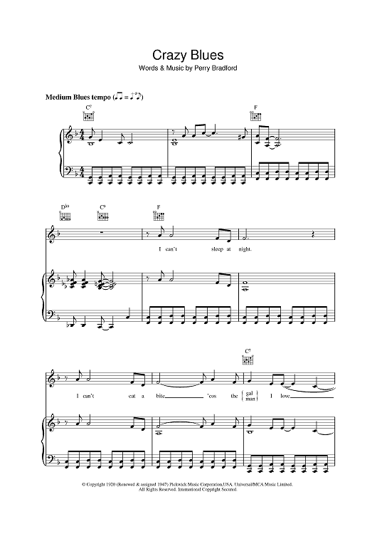 Digital Sheet Music for Crazy Blues by Perry Bradford scored for Piano/Vocal/Chords; id:392787