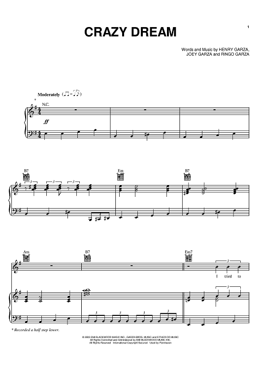Digital Sheet Music for Crazy Dream by Henry Garza, Joey Garza, Ringo Garza, Los Lonely Boys scored for Piano/Vocal/Chords; id:380556
