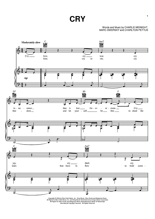 Digital Sheet Music for Cry by Charlie Midnight, Charlton Pettus, Marc Swersky, Hilary Duff scored for Piano/Vocal/Chords; id:383195