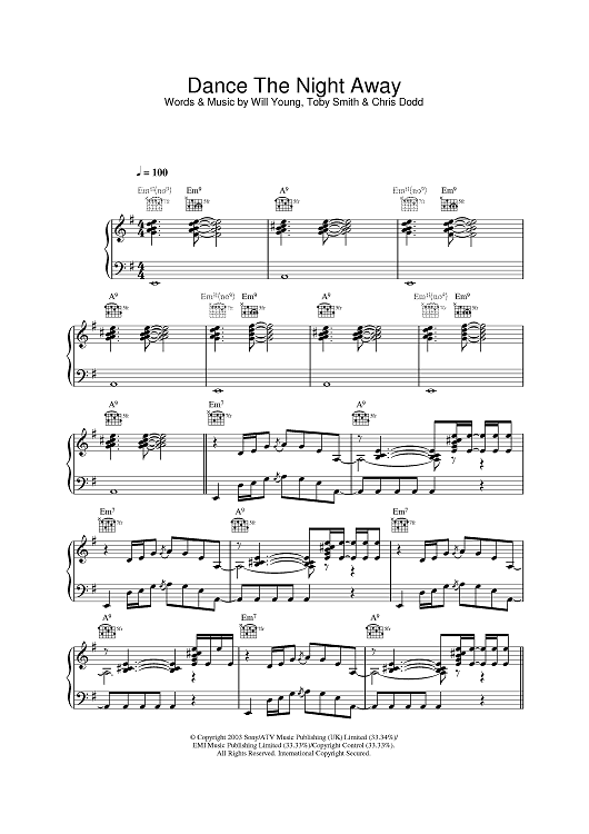 Digital Sheet Music for Dance The Night Away by Chris Dodd, Toby Smith, Will Young scored for Piano/Vocal/Chords; id:378350
