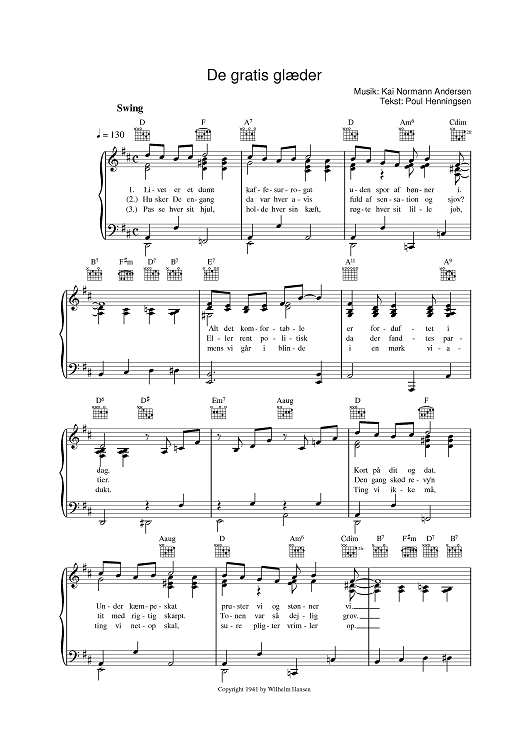 Digital Sheet Music for De Gratis Glæder by Kai Normann Andersen, Poul Henningsen scored for Piano/Vocal/Chords; id:388335