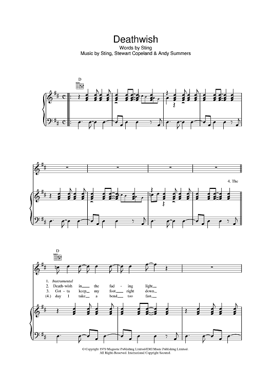 Digital Sheet Music for Deathwish by Sting, The Police, Stewart Copeland, Andy Summers scored for Piano/Vocal/Chords; id:390297