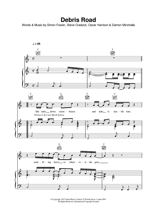 Digital Sheet Music for Debris Road by Steve Cradock, Simon Fowler, Oscar Harrison, Ocean Colour Scene scored for Piano/Vocal/Chords; id:379850