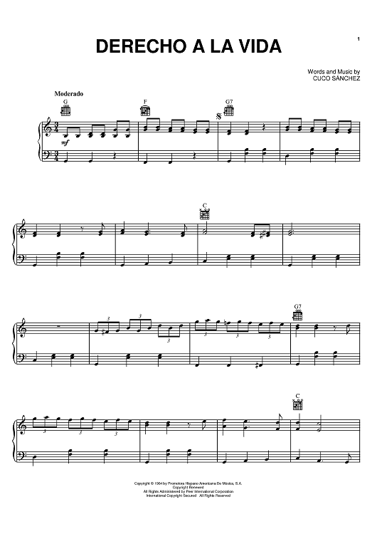 Digital Sheet Music for Derecho A La Vida by Conjunto Primavera, Cuco Sanchez scored for Piano/Vocal/Chords; id:383125