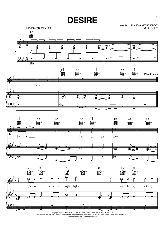 Digital Sheet Music for Desire by U2, Bono, The Edge scored for Piano/Vocal/Chords; id:381986