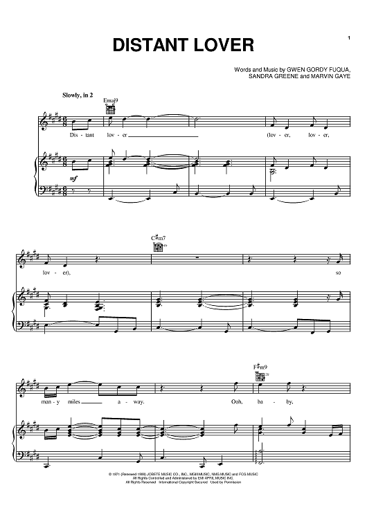 Digital Sheet Music for Distant Lover by Marvin Gaye, Michael McDonald, Gwen Gordy Fuqua, Sandra Greene scored for Piano/Vocal/Chords; id:394863
