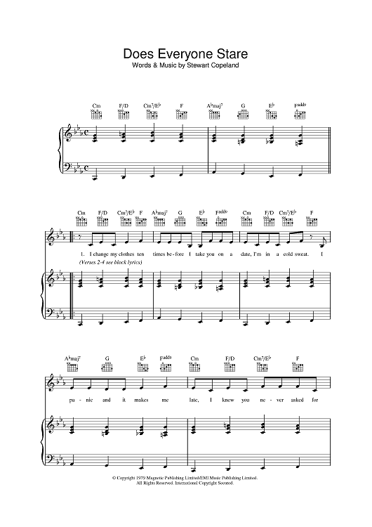 Digital Sheet Music for Does Everyone Stare by The Police, Stewart Copeland scored for Piano/Vocal/Chords; id:390305