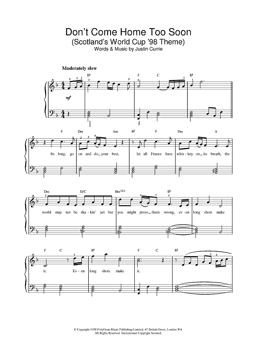 "Don't Come Home Too Soon (Scotland's World Cup '98 Theme)" Sheet Music by Justin Currie
