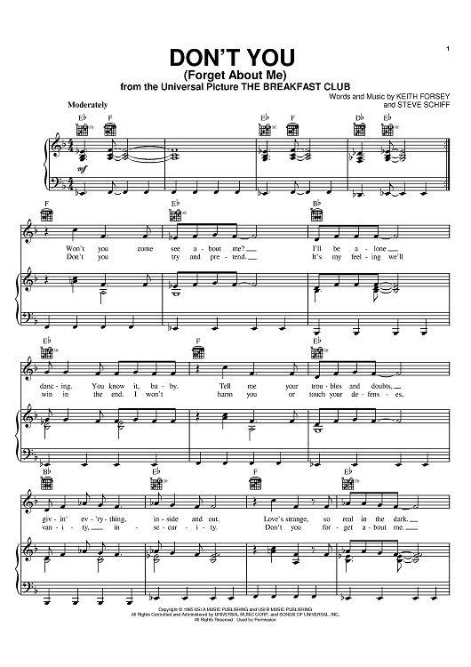 Digital Sheet Music for Don't You (Forget About Me) by Simple Minds, Keith Forsey, Steve Schiff scored for Piano/Vocal/Chords; id:381336