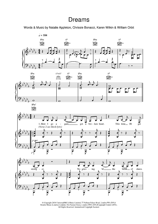 Digital Sheet Music for Dreams by William Orbit, All Saints, Natalie Appleton, Chrissie Bonacci, Karen Wilkin scored for Piano/Vocal/Chords; id:377185