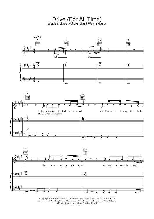 Digital Sheet Music for Drive (For All Time) by Westlife, Steve Mac, Wayne Hector scored for Piano/Vocal/Chords; id:380167