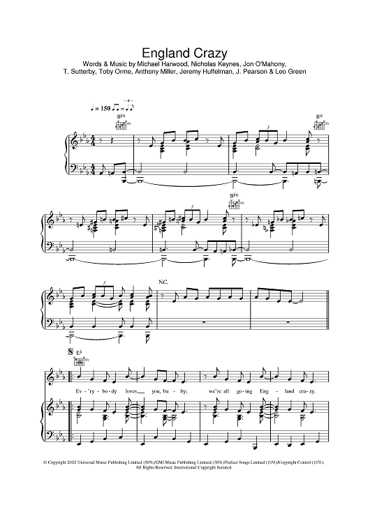 Digital Sheet Music for England Crazy by Leo Green, Michael Harwood, Jeremy Huffelman, Nicholas Keynes, Anthony Miller, Jon O'Mahony, Toby Orme, J. Pearson, Rider, T. Sutterby scored for Piano/Vocal/Chords; id:390835