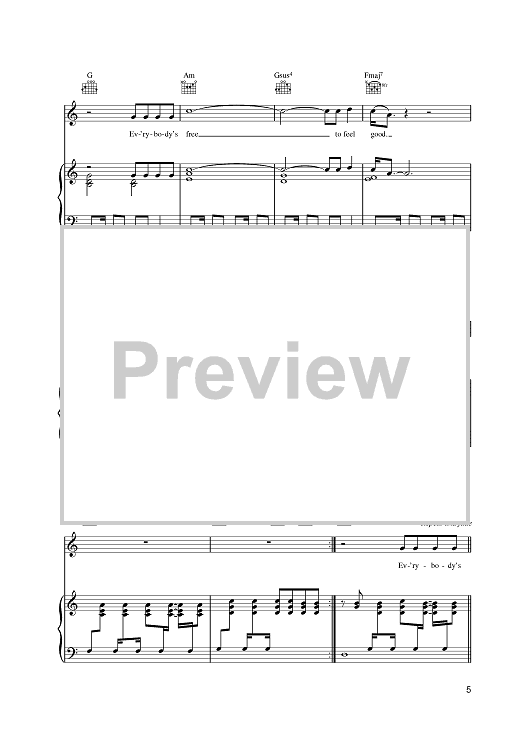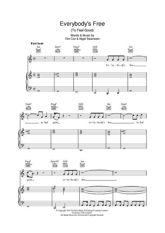 Digital Sheet Music for Everybody's Free (To Feel Good) by Tim Cox, Nigel Swanston, Rozalla scored for Piano/Vocal/Chords; id:401329