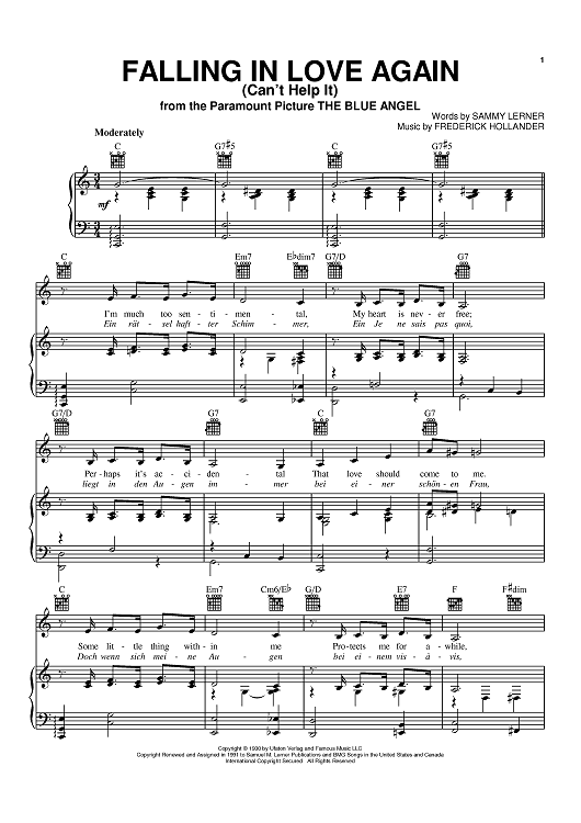 Digital Sheet Music for Falling In Love Again (Can't Help It) by Linda Ronstadt, Sammy Lerner, Frederick Hollander, Marlene Dietrich scored for Piano/Vocal/Chords; id:368586
