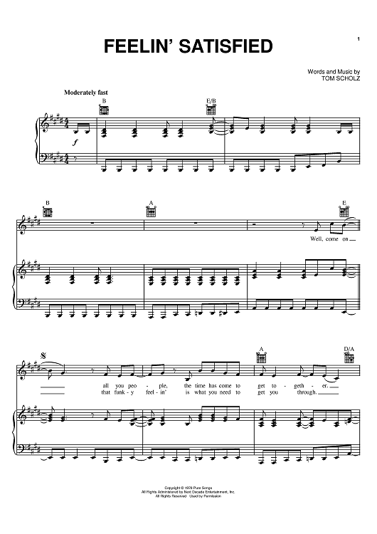 Digital Sheet Music for Feelin' Satisfied by Boston, Tom Scholz scored for Piano/Vocal/Chords; id:402810