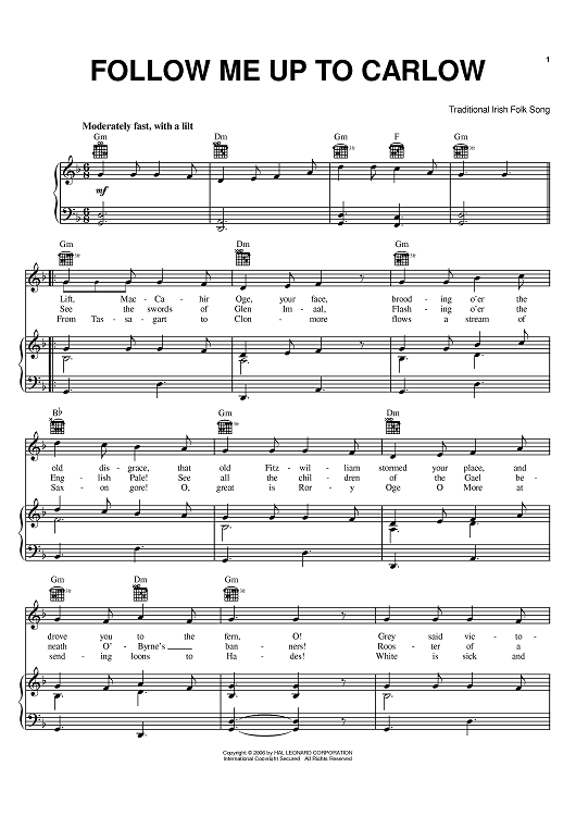 Digital Sheet Music for Follow Me Up To Carlow by scored for Piano/Vocal/Chords; id:393994