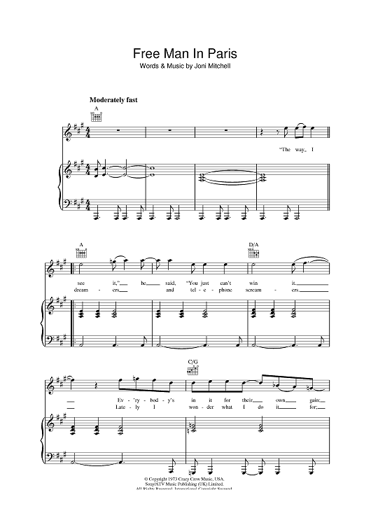 "Free Man In Paris" Sheet Music by Joni Mitchell