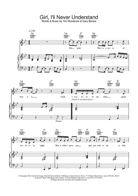 Digital Sheet Music for Girl I'll Never Understand by Gary Barlow, Blue, Tim Woodcock scored for Piano/Vocal/Chords; id:382617