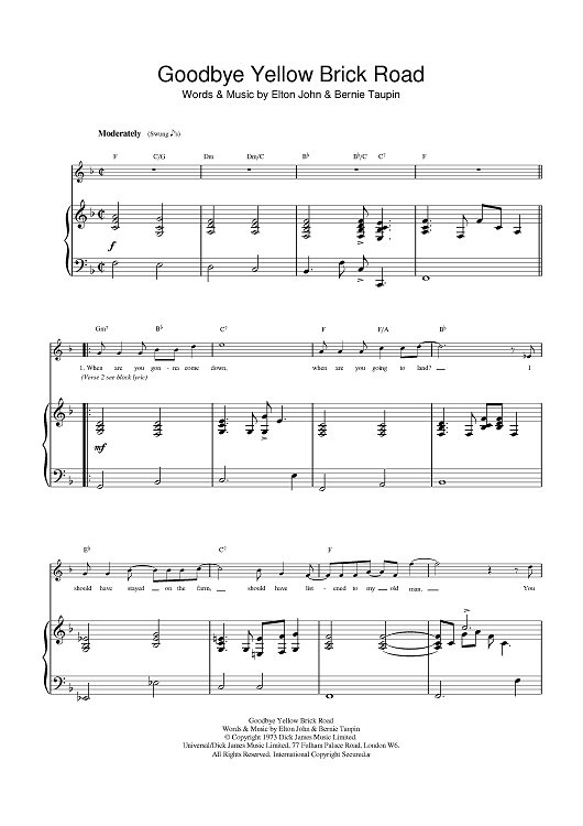 Digital Sheet Music for Goodbye Yellow Brick Road by Elton John, Bernie Taupin scored for Piano/Vocal/Chords; id:375738
