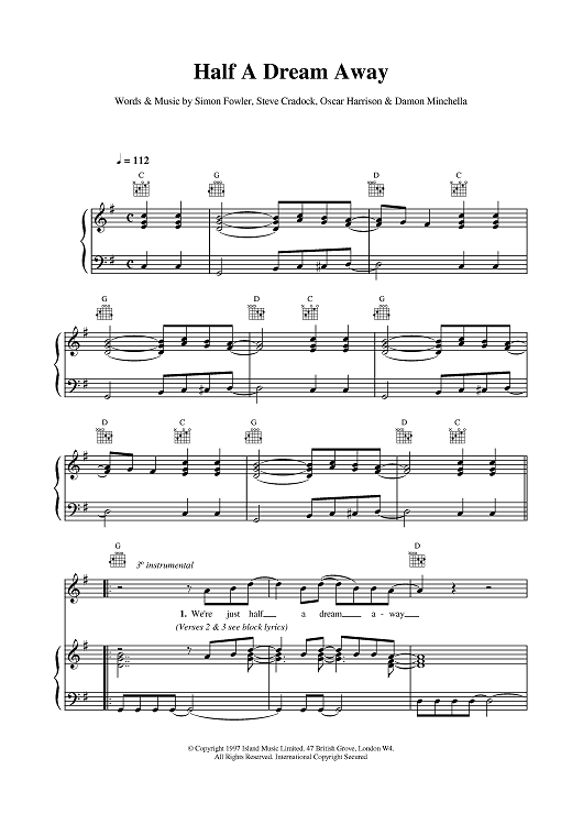 Digital Sheet Music for Half A Dream Away by Steve Cradock, Simon Fowler, Oscar Harrison, Ocean Colour Scene scored for Piano/Vocal/Chords; id:379856