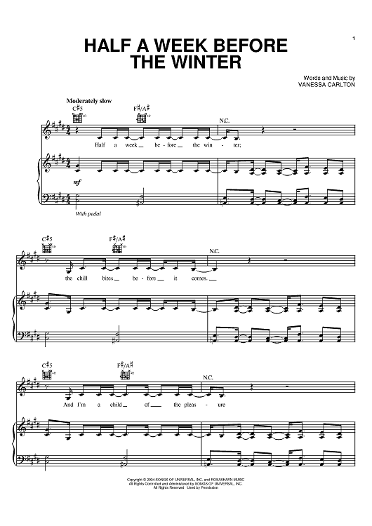 Digital Sheet Music for Half A Week Before The Winter by Vanessa Carlton scored for Piano/Vocal/Chords; id:384428