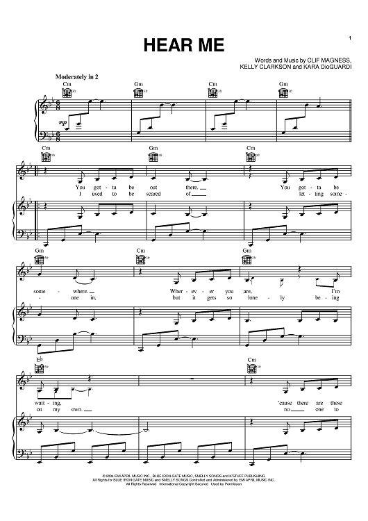 Digital Sheet Music for Hear Me by Clif Magness, Kara DioGuardi, Kelly Clarkson scored for Piano/Vocal/Chords; id:385643