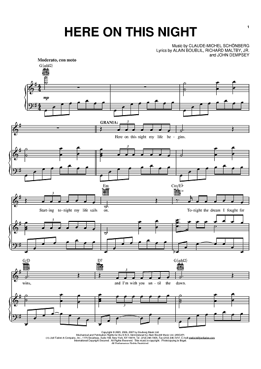 Digital Sheet Music for Here On This Night by Claude-Michel Schonberg, Alain Boublil, John Dempsey, Richard Maltby Jr. scored for Piano/Vocal/Chords; id:397544