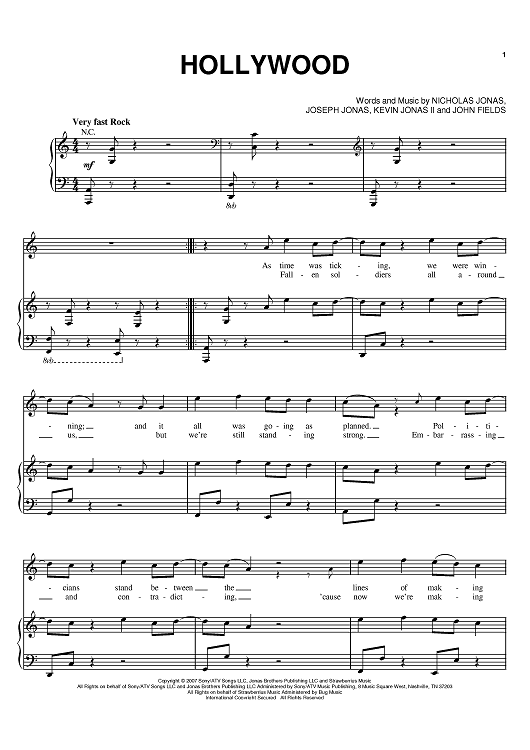Digital Sheet Music for Hollywood by Nicholas Jonas, Joseph Jonas, Kevin Jonas II, Jonas Brothers, John Fields scored for Piano/Vocal/Chords; id:402237