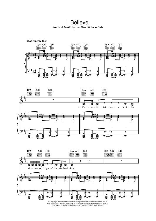 Digital Sheet Music for I Believe by John Cale, Lou Reed scored for Piano/Vocal/Chords; id:401895