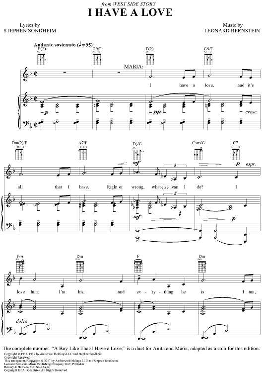 Digital Sheet Music for I Have a Love by Stephen Sondheim, Leonard Bernstein scored for Piano/Vocal/Chords; id:404863