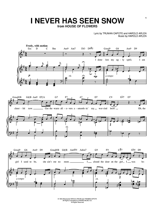 Digital Sheet Music for I Never Has Seen Snow by Harold Arlen, Pearl Bailey, Truman Capote, Audra McDonald scored for Piano/Vocal/Chords; id:385736