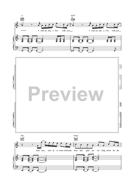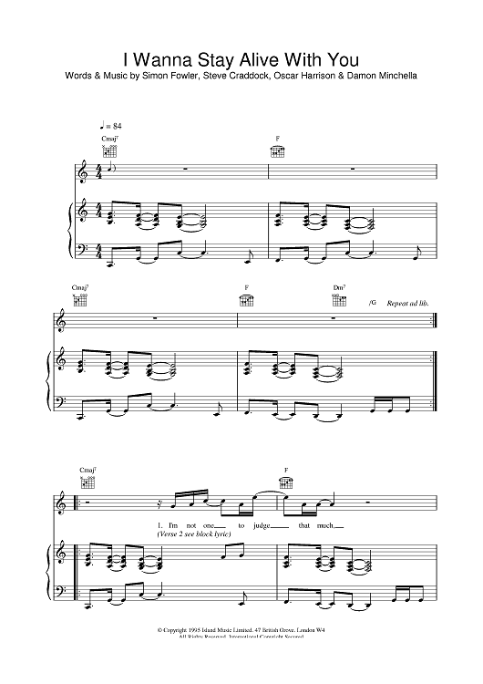 Digital Sheet Music for I Wanna Stay Alive With You by Steve Cradock, Simon Fowler, Oscar Harrison, Damon Minchella, Ocean Colour Scene scored for Piano/Vocal/Chords; id:379801