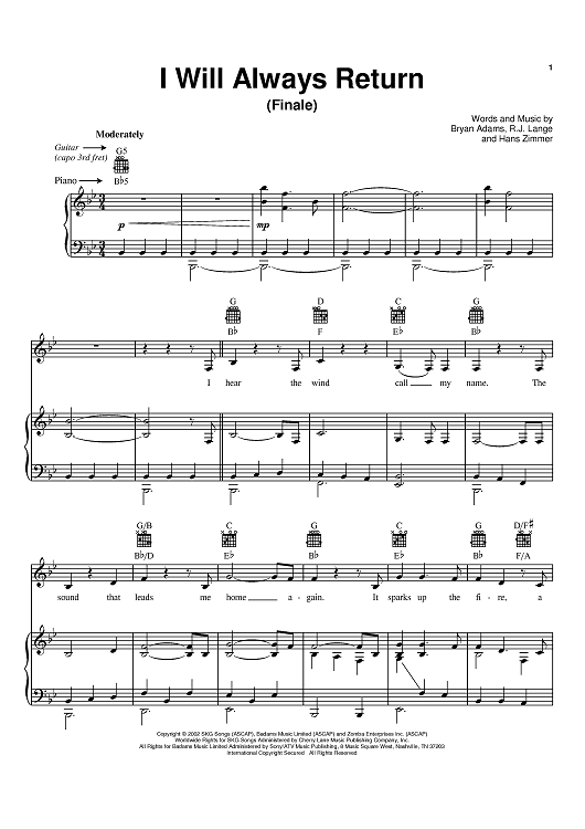 Digital Sheet Music for I Will Always Return (Finale) by Bryan Adams, Hans Zimmer, Robert Lange scored for Piano/Vocal/Chords; id:370403