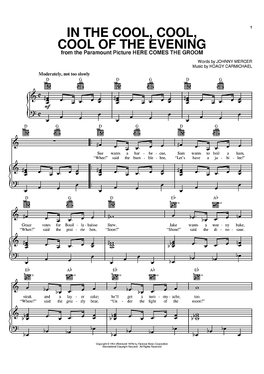 Digital Sheet Music for In The Cool, Cool, Cool Of The Evening by Johnny Mercer, Hoagy Carmichael scored for Piano/Vocal/Chords; id:368266