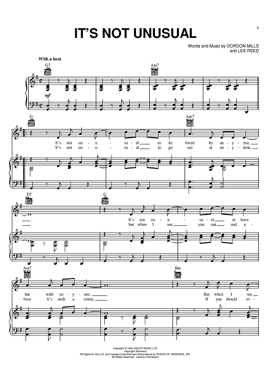 Digital Sheet Music for It's Not Unusual by Tom Jones, Les Reed, Gordon Mills scored for Piano/Vocal/Chords; id:381631