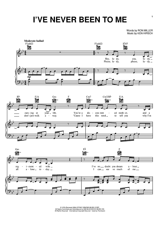 Digital Sheet Music for I've Never Been To Me by Ron Miller, Ken Hirsch, Charlene scored for Piano/Vocal/Chords; id:398172