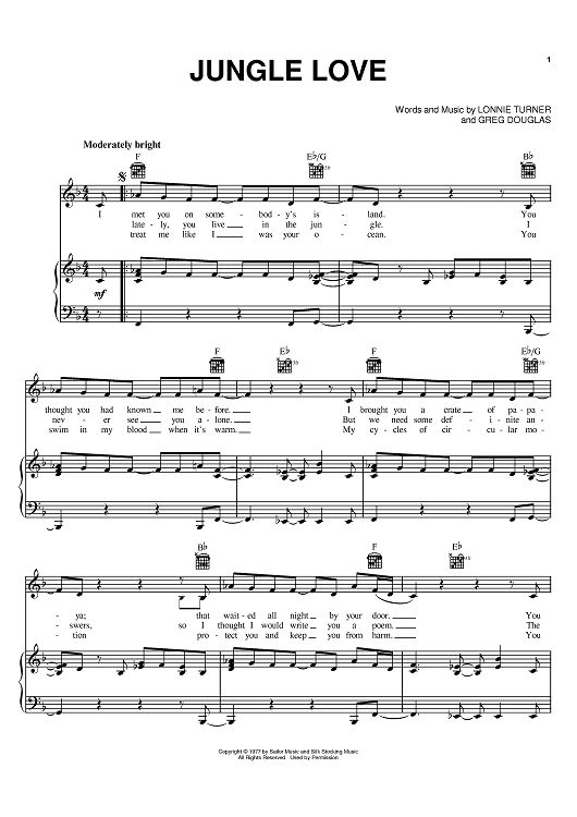 Digital Sheet Music for Jungle Love by Greg Douglas, Steve Miller Band, Lonnie Turner scored for Piano/Vocal/Chords; id:386236