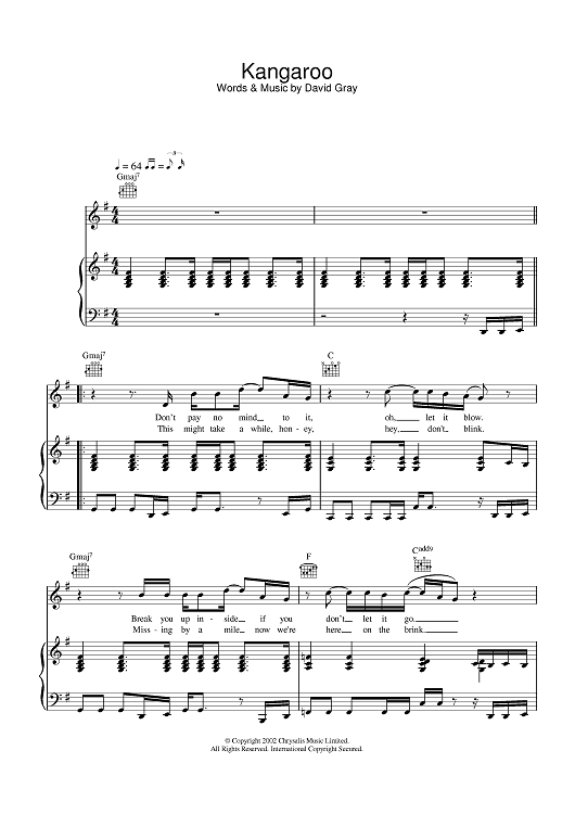 Digital Sheet Music for Kangaroo by David Gray scored for Piano/Vocal/Chords; id:377775